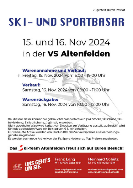 Dieses Jahr findet erstmals ein allgemeiner Sportbasar im örtlichen Volksschulturnsaal statt und es können gebrauchte Sportartikeln jeder Art erworben werden.